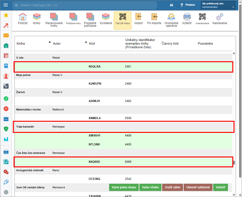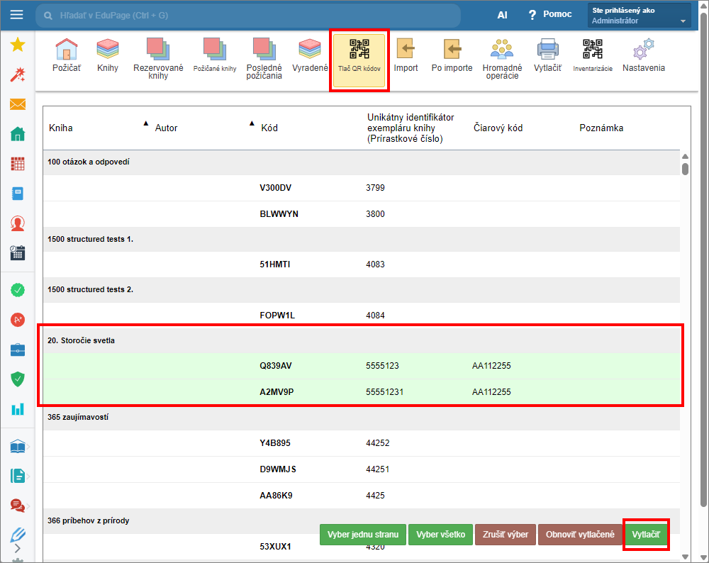 Ak potrebujete vytlačiť zo zoznamu iba QR kódy niektorých exemplárov, vyberte tieto kliknutím na ich riadok. V prípade viacerých exemplárov pod jedným titulom, kliknutím na riadok titulu sivej farby, vyberiete všetky exempláre daného titulu naraz. Opätovným kliknutím na položku výber zrušíte. Po vybratí požadovaných položiek kliknite “Vytlačiť”.