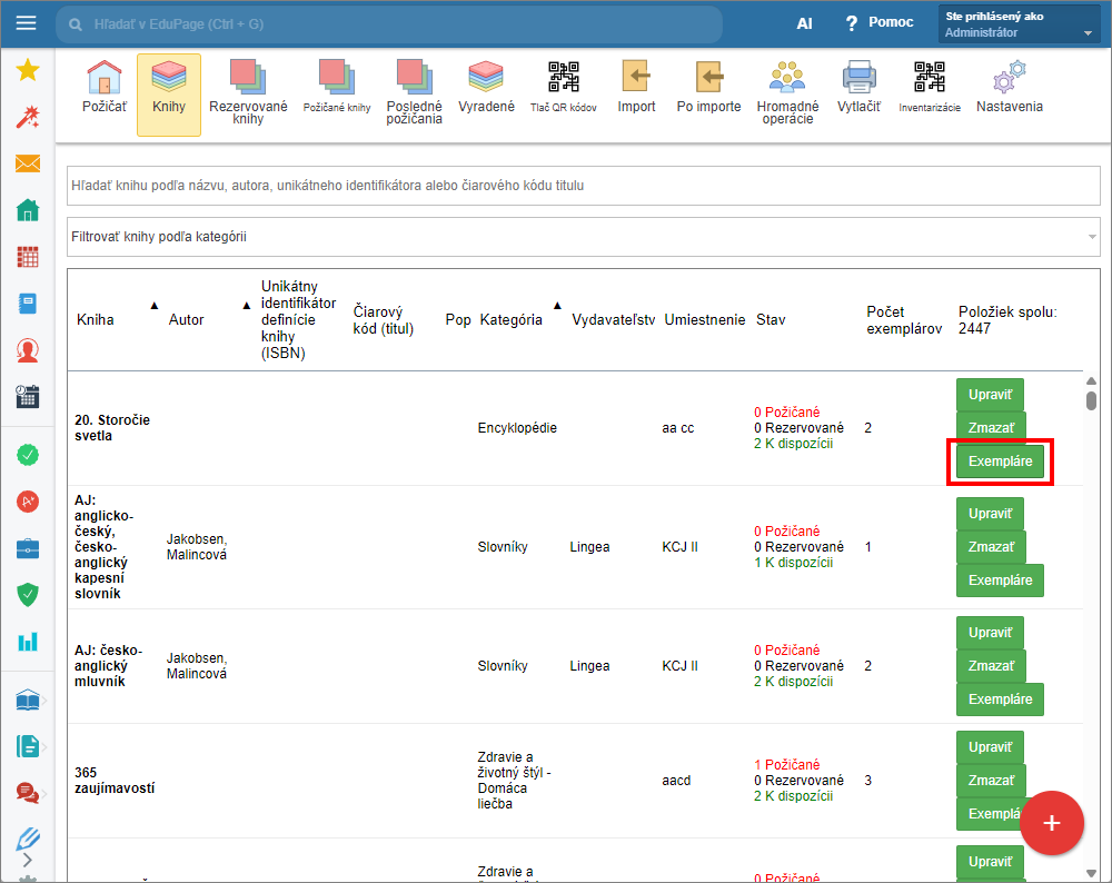 Budú vybraté všetky exempláre kníh v zozname. Vybraté exempláre sú podfarbené zelenou farbou.