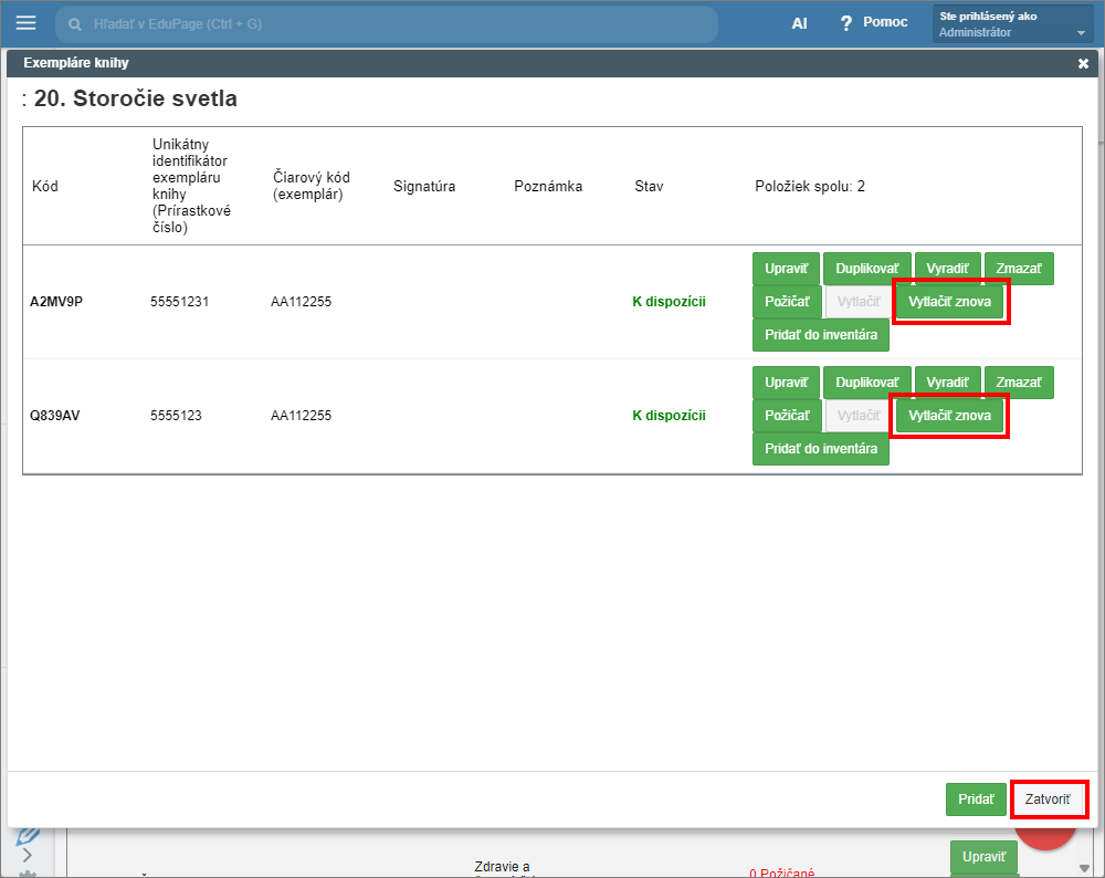 Exemplár knihy bude opäť viditeľný v zozname na tlač QR kódov. Kliknite na “Vytlačiť znova” pri každom exempláre, ktorému chcete opätovne vytlačiť QR kód. Následne prejdite do záložky "Tlač QR kódov" a vytlačte požadované QR kódy, ktoré už sú opäť zobrazené v zozname. Vyberte požadované, alebo všetky položky a kliknite “Vytlačiť”.
