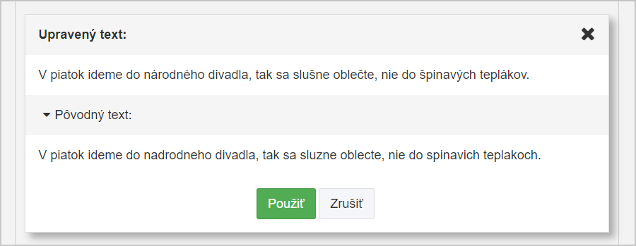 EduPage AI doplní diakritiku, opraví preklepy a prípadne navrhne zmeny v slovoslede. Ak ich chcete prijať, klinite na "Použiť".