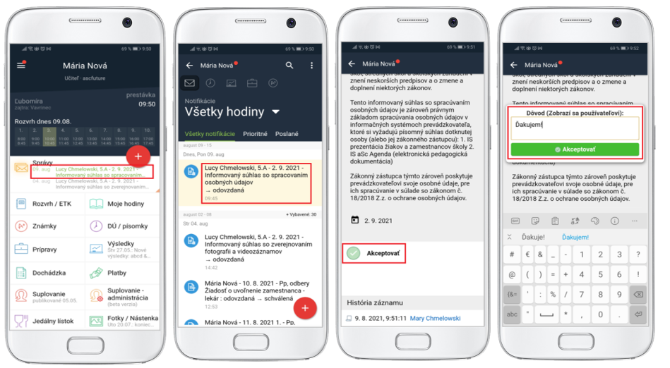Či už na webe alebo v mobilnej aplikácii učiteľ vidí informáciu o odovzdanom Informovanom súhlase v správach.