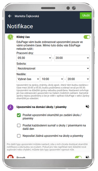 Samotné zprávy ve vašem EduPage uvidíte vždy. Nebudou vás však rušit notifikace v čase, ve kterém si je nepřejete dostávat.