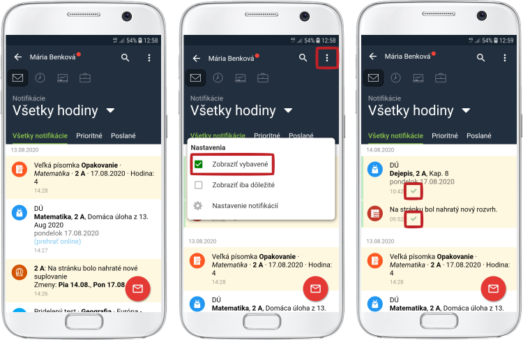 Aby sa v zozname zobrazovali všetky správy/DÚ, kliknite na 3 bodky v pravom hornom rohu a zaškrtnite Zobraziť vybavené. Vybavené správy sú označené zelenou fajočkou.